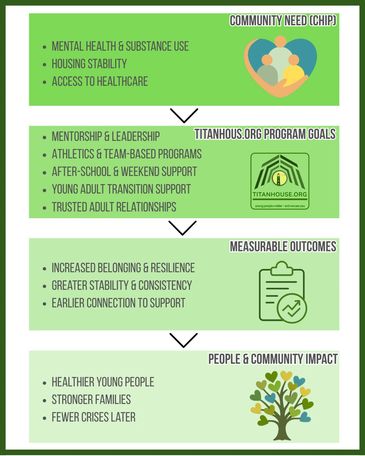 This diagram shows the framework Titanhouse.org applies to turn community health priorities into real outcomes for young people